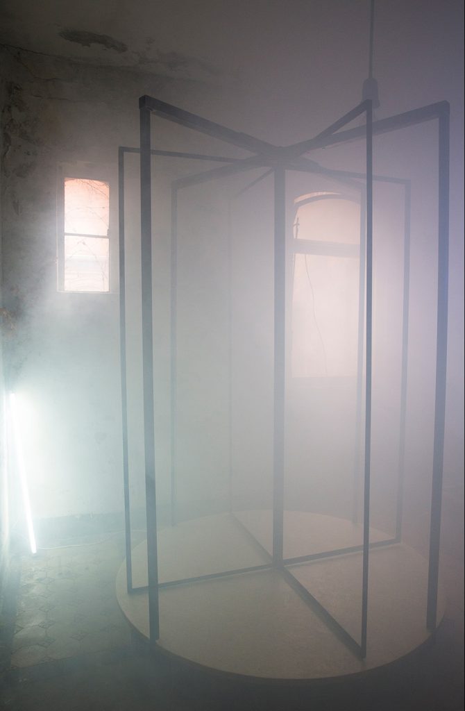 both passageway and endless carousel. Visitors to the performance were free to enter and leave the revolving door at will. Upon exiting through one of the four exits, a safety sensor triggered one of four live performed sound sequences, in which the concept of flesh in relation to life and decay was poetically reflected upon.